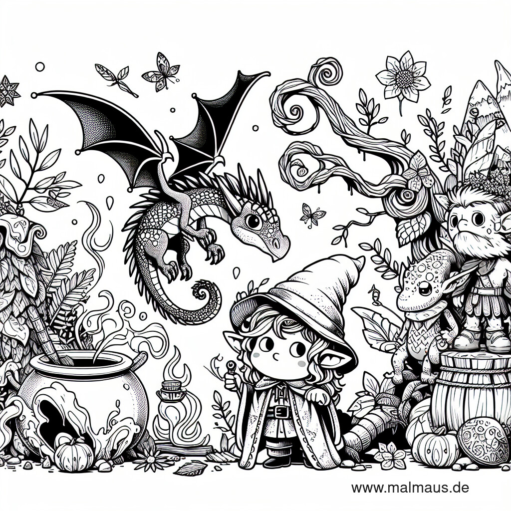 Der Clou an unserem Ausmalbild sind die niedlichen Accessoires, die jeder Figur und jedem Element eine ganz persönliche Note verleihen. Stellt euch vor, ihr verleiht einem Zauberstab einen Hauch von Glitzer, färbt einen Drachenschuppenkamm in den lebhaftesten Farben oder verziert die Flügel eines Feenfreundes mit Mustern, die in eurer Welt noch nie jemand gesehen hat.