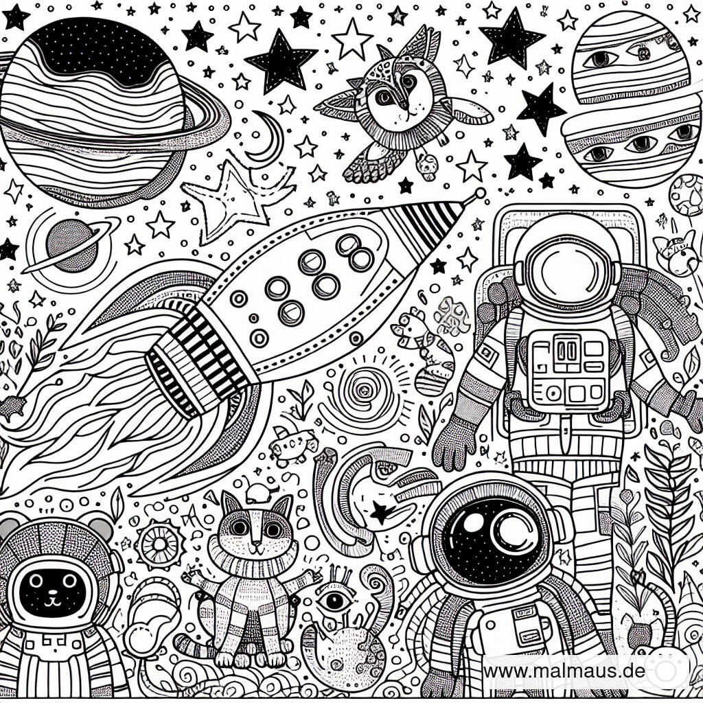 Stürze dich mit Buntstiften, Filzstiften oder Wasserfarben in dieses Abenteuer und gib jedem Element auf der Seite deinen persönlichen Touch. Beim Ausmalen dieses Bildes kannst du nicht nur deiner Kreativität freien Lauf lassen, sondern auch ein kleines Stück des Universums nach deinen Vorstellungen gestalten. Es ist Zeit, die Sterne vom Himmel zu holen und sie in deinem Zimmer leuchten zu lassen. Starte deine kreative Reise jetzt und bringe den Weltraum mit Farben und Freude zum Strahlen!
