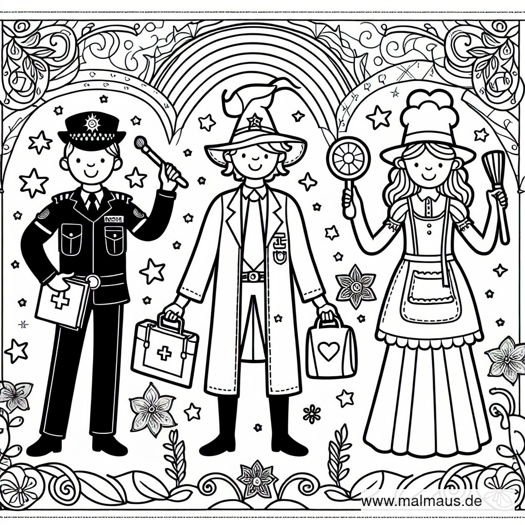 Beim Ausmalen dieses Bildes könnt ihr gemeinsam entscheiden, welche Farben Leos Traumfäden haben und wie Mias magisches Wetter aussehen soll. Jeder Stiftstrich ist ein Schritt weiter in die Welt der Fantasie, wo Berufe nicht nur Jobs, sondern Abenteuer sind. Lasst uns gemeinsam die Magie entfesseln und sehen, wohin uns die Reise führt. Viel Spaß beim Ausmalen und Träumen!