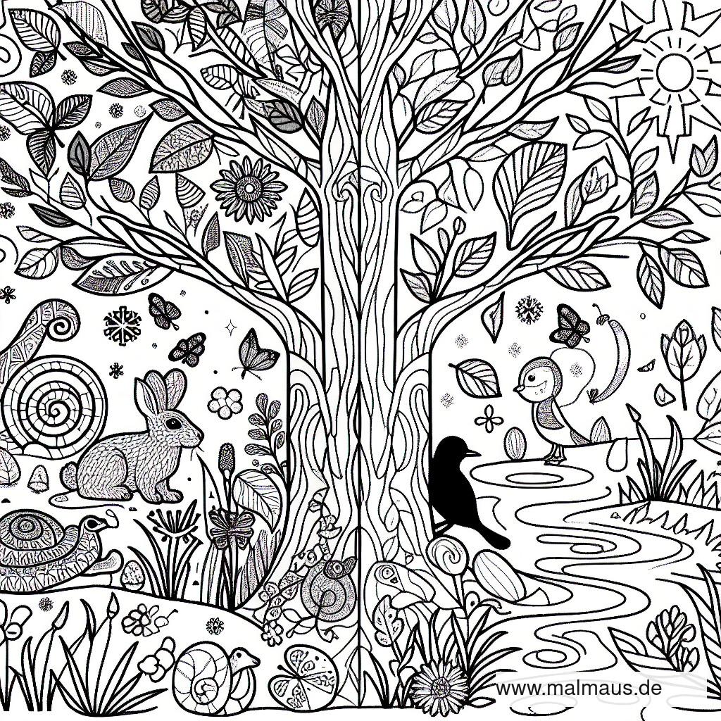 Unser Ausmalbild ‚Zauberwald der Jahreszeiten‘ lädt dich nicht nur zum Malen, sondern auch zum Träumen ein. Jedes Tier, jeder Baum und jede Blume hat seine eigene Geschichte zu erzählen. Bist du bereit, diese Geschichten zu entdecken und dem Wald mit deinen Farben Leben einzuhauchen? Das Abenteuer beginnt jetzt.