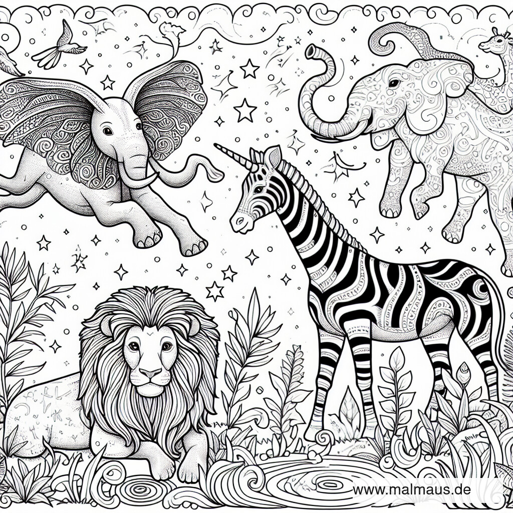 Entdecke Zauberhaftes: Ausmalbild Safari mit Märchenmotiven