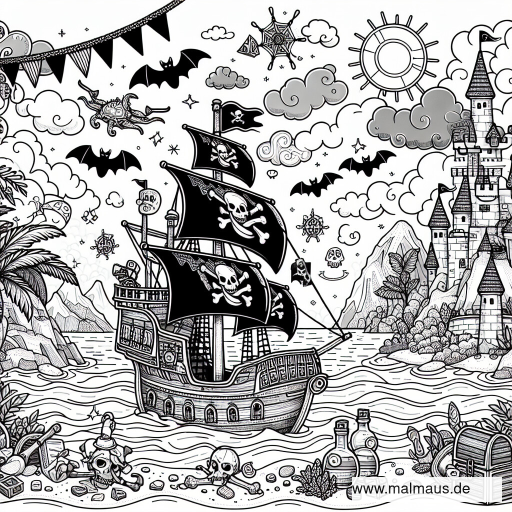 Begebt Euch auf ein farbenfrohes Abenteuer mit dem Ausmalbild ‚Fantastische Piratenabenteuer‘